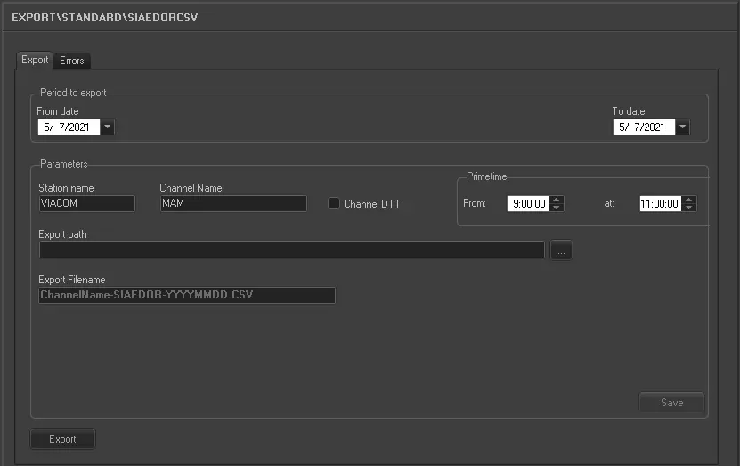 •Export filename: Define the file name for the exported file. The filename format is: "ChannelName-SIAE DOR-YYYYMMDD-YYYYMMDD.csv"