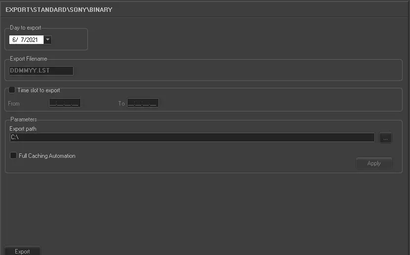 The Sony Binary export creates a file in binary format (.LDT) containing the schedule of a specific day. This export is useful in cases where the broadcast schedule is created in Etere but transmitted by another transmission software (e.g. Sony BZA830).
