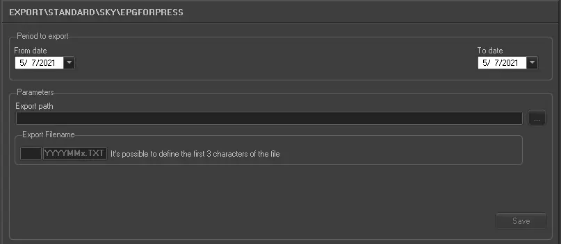 The SKY - EPG TXT option allows the user to export a plain-text file (.txt) containing the broadcast playlist of one more days including the EPG information related to the events scheduled on them.