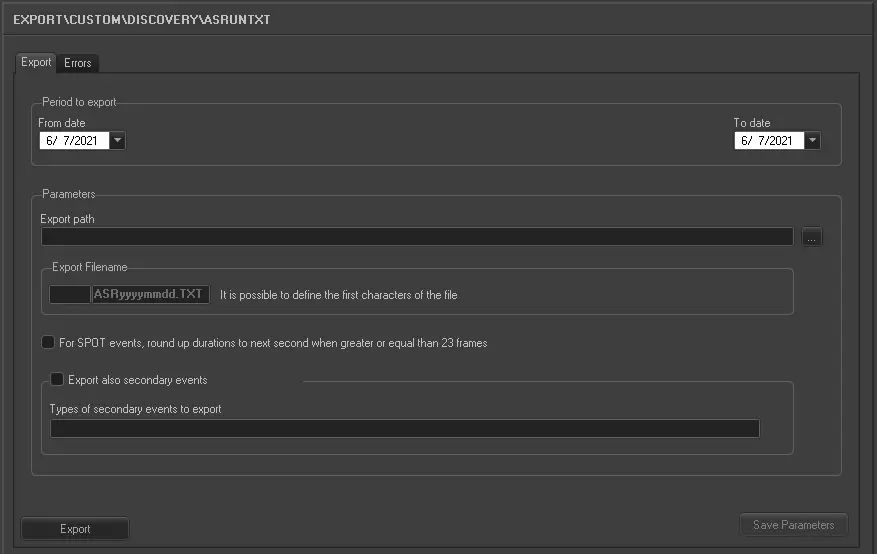 The "Discovery - AsRun TXT" export function allows creating a TXT file containing the events transmitted by the current station on a certain day(i.e. daily playlist), specifying for each event a transmission status: