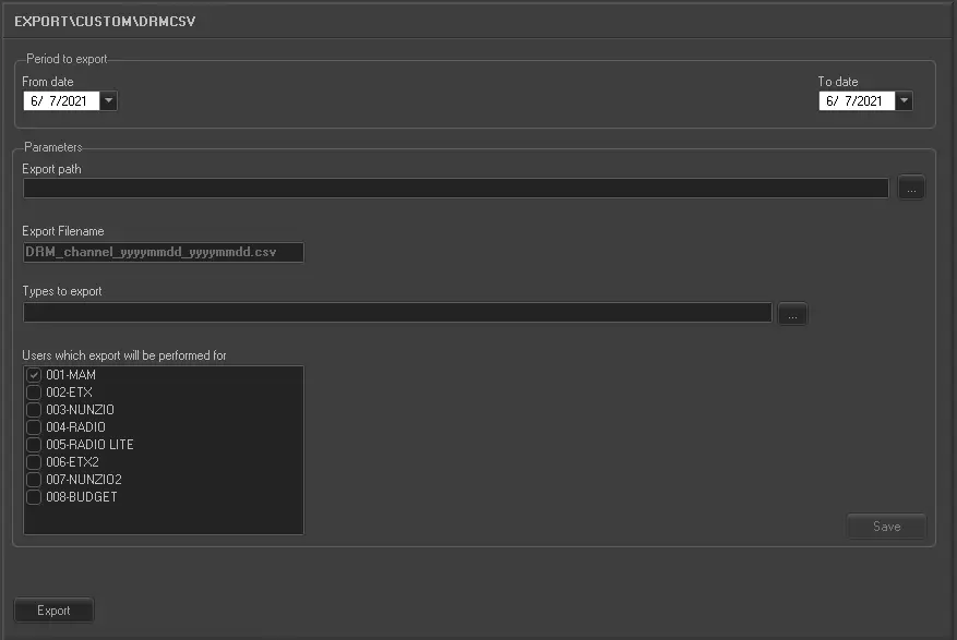 •Export Filename: Specify the file name of the CSV file to be created when export is executed. The file name format is "DRM_channel_yyyymmdd_yyyymmdd.csv", e.g. "DRM_PARAMOUNT_20210101_20210612.csv" where first date is the start date, second date is the end date of export.