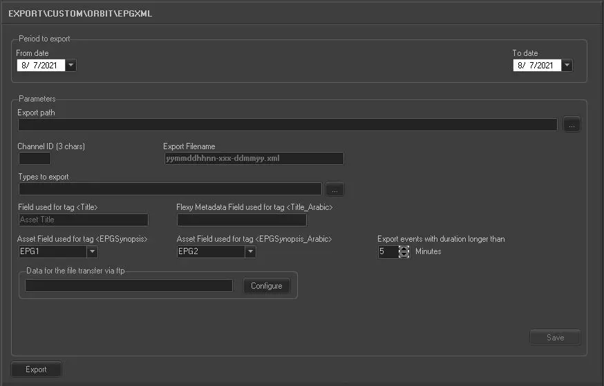 The export custom ORBIT EPG XML export to a XML file containing one day schedule for the playout system. The exported file name format is “MG_XXX_dd-mm-yyyy_dd-mm-yyyy.xml”, where XXX is the 3 characters channel ID.