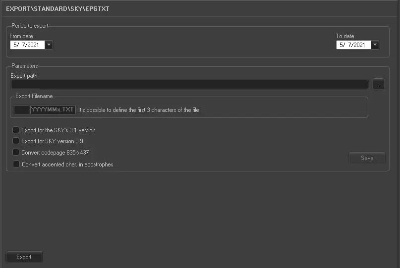 The SKY - EPG TXT option allows the user to export a plain-text file (.txt) containing the broadcast playlist of one more days including the EPG information related to the events scheduled on them.