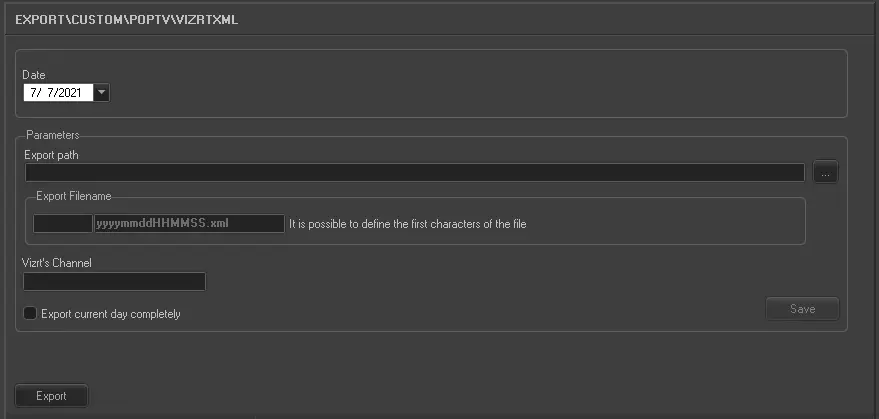 This function will export only primary and secondary events previously imported using the Standard XML Import > VIZRT mode, that is, which have a "VIZRT" source (i.e. <type>VIZ</type>).