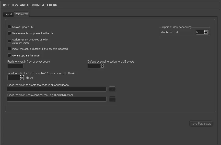 •Import into the level 701, if within 'n' hours before the on-air: If enabled, data imported 'x' hours before the on-air time will be directly imported into the level 701 (i.e.: the real schedule), thus avoiding the manual confirmation of changes that could result on an undesired loss of time.