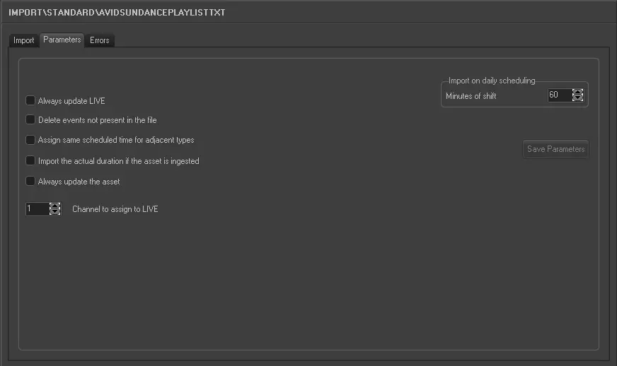 The AVID Sundance Playlist TXT allows importing a file in TXT format containing the events scheduled in the playlist of a specific day.