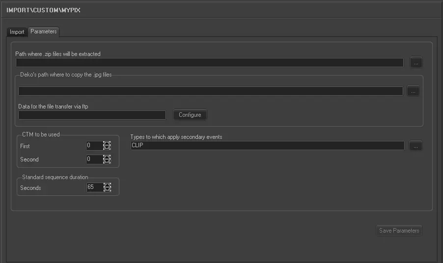 The MYPIX custom import permits to receive a .zip file containing an .XML file (mypix.xml) and various .JPG files; Etere decompress the -zip file into the configured path and copy all .JPG files into the DEKO directory (and/or a FTP path) and import into the Etere database all secondary events present in the .XML file.