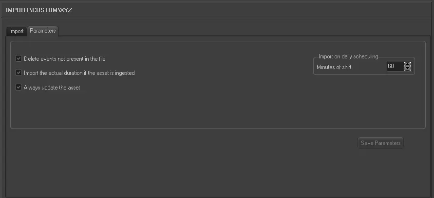 •Import on daily scheduling: If you are importing the schedule for the current day, this parameter defines what time on the schedule the import starts from. It is calculated as Current time + Time shift. Events with a start time before the current time will not be imported.