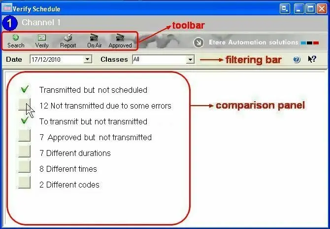 It will compare the approved schedule of the selected date (if available) against the on-air schedule of the same date, filtering only those events matching the selected 'class'. Results will be displayed in the panel below, indicating: