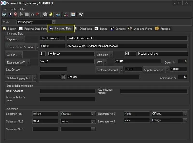 The Invoicing Data section allows to define all the relevant billing information for each contact (e.g. payment type, account, VAT, pay limit, commissions, etc) in order to save time while filling contracts: