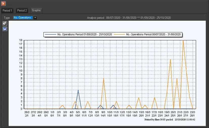 Under the Graphic tab a Graphic Statistic is available through a Line Chart used to interpolate between dates and a specific parameter (i.e.: size, n. operations, duration), which compose the X & Y coordinates respectively: