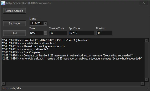 This plugin automatically sends information, however, pressing the [SyncroADV Service] button available in the bottom part of the Playout Status window will allow to manually send commands to the SyncroADV server: