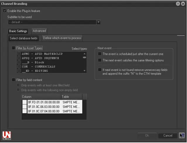 It is possible to choose any kind of field belonging to the assets repository table (filmati), the scheduled assets table (tpalinse) and also the SMPTE metadata table. With the advanced insertion you are able to better filter assets that can be assigned graphic titles. The following parameters can be set: