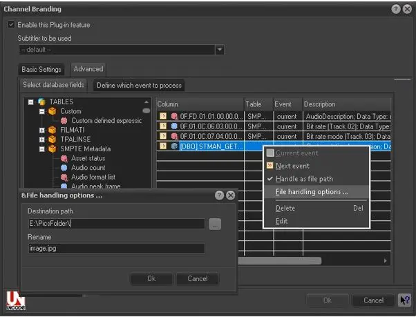 3. Make right-click on the custom database field and select to "handle it as a file path" to indicate to the system that this field contains the name of a file. Then, set its "File handling options" (i.e. for the file transferring and renaming):