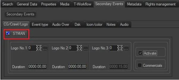 2.Then in the asset form under properties the tab STMan will appear. The entry and the exit template should be inserted as Logo No.1 and Logo No.3 (these script files must also be saved in the Etere folder) for the asset that I want to broadcast with a different graphic.