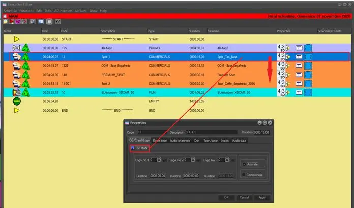 The use of Container secondary events within a schedule will permit to insert graphic titles into a whole block of events (differently configured across their STMan tabs); this operation can be performed by following the next procedure: