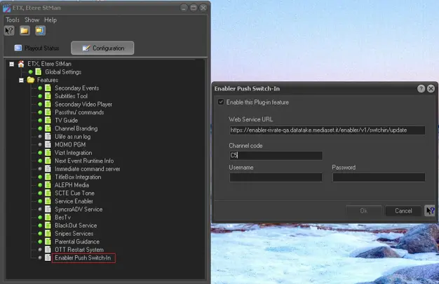 Launch Etere STMan and double-click the “Enabler Push Switch-In” feature under the Configuration tab.