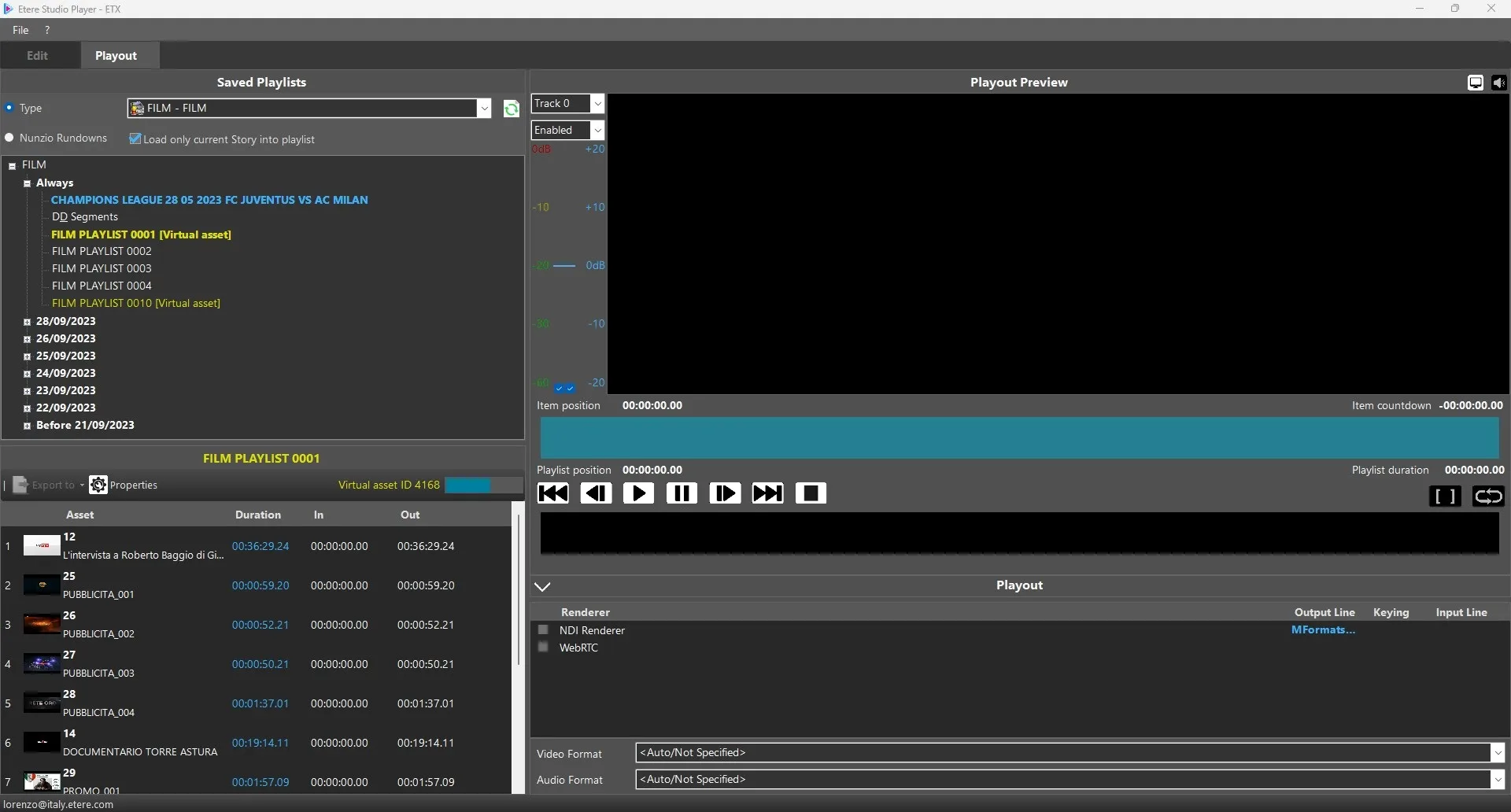 In Studio Player > Playout, there are mainly 4 areas where you can manage the playout. These areas are: SAVED PLAYLIST - PLAYLIST - PLAYOUT PREVIEW - PLAYOUT