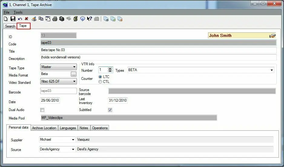 Once a tape have been either searched or created, it will be possible to modify its main information under the Tape tab which is mainly formed by the following areas: