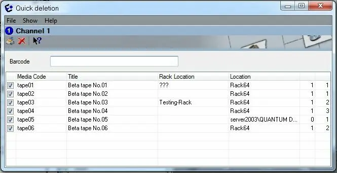 Quick deletion - This function opens a form which allows, by manually inserting the barcode of a VIDEO tape(s), to either 'delete their contents' (i.e. remove all asset associations) or 'delete the tapes themselves' (i.e. remove them from the database):
