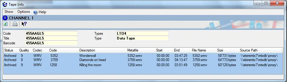 NB: Please note that "metafile", "filename", "size" and "source path" information is displayed only for data tapes (e.g. LTO5).