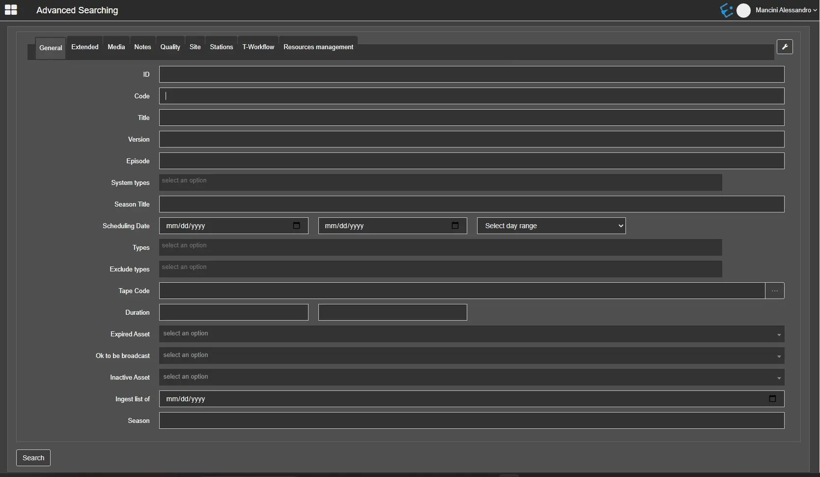 Tape code:Search by tape code. It's possible to select the tape to search by clicking on the button beside this field;