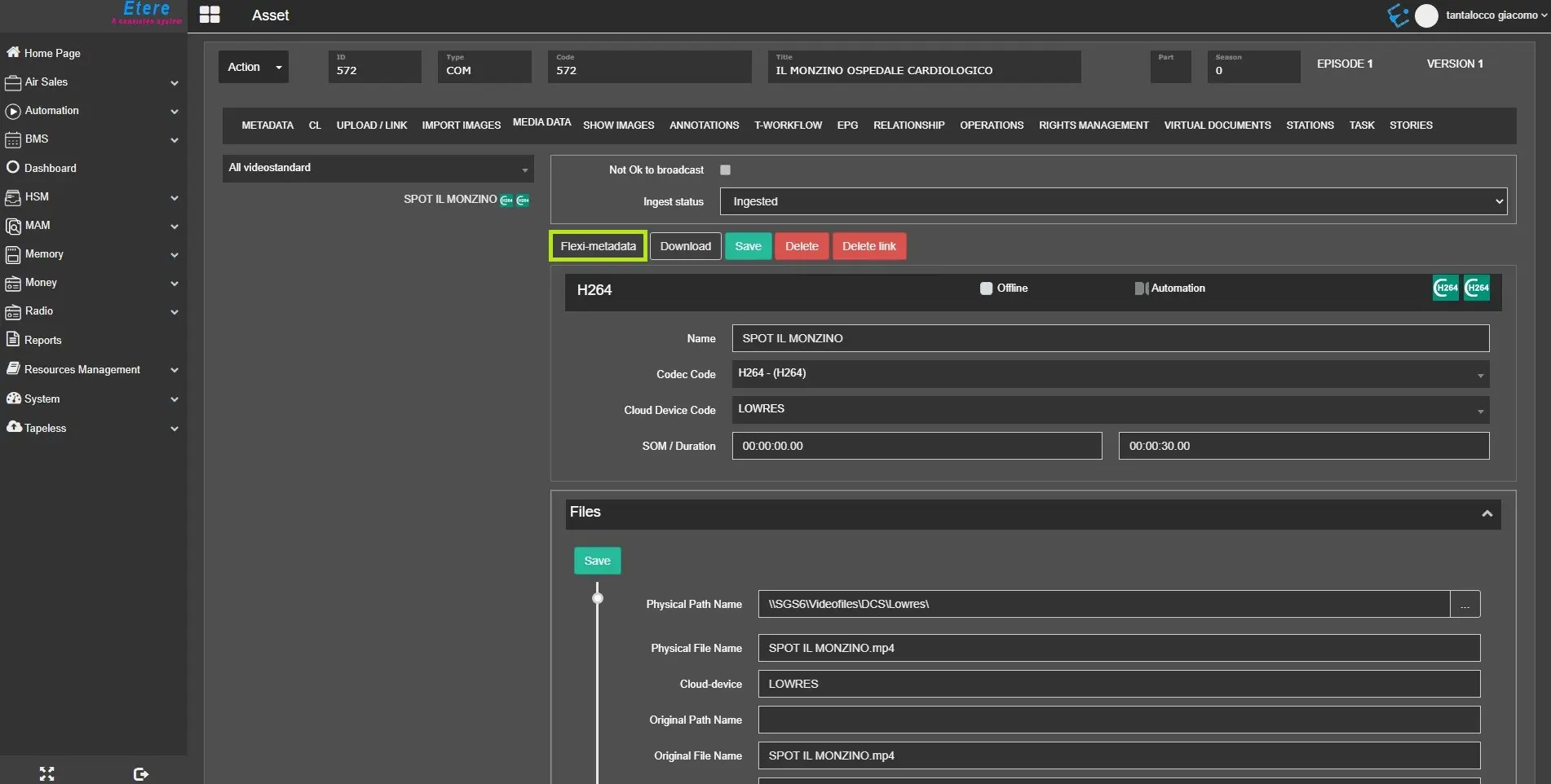 The Flexi-metadata button lets users see the same list directly from the media data tab.
