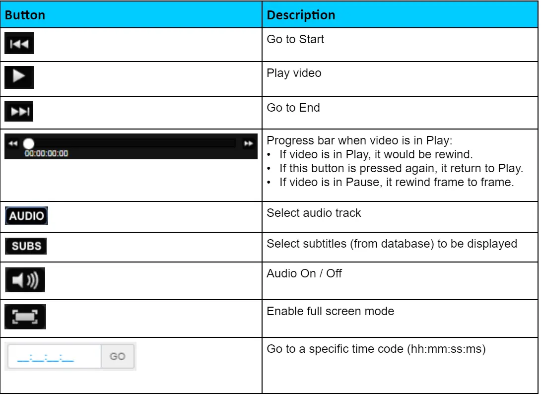 AUDIO and SUBS buttons allow to choose the audio track to reproduce in case of multitrack audio media (only one at time) and to choose language of subtitles to be shown (if existing on database for that asset).
