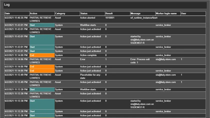 The Log section in the user interface contains detailed information on T-workflow actions performed.
