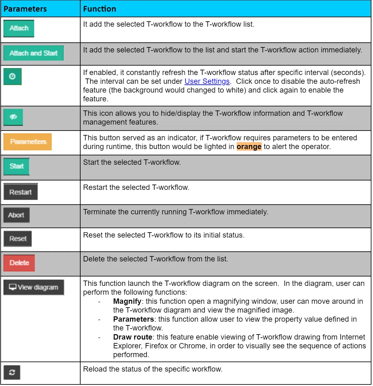 - Reset: Reset the selected T-workflow to its initial status.