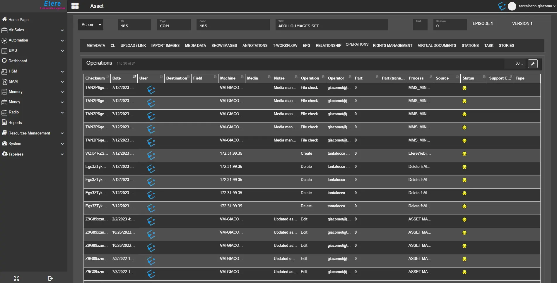 The Operations TAB contains a list of operations performed on a current asset. By default, the column names in this tab are similar to those in Media Library’s Operations tab in the desktop application.