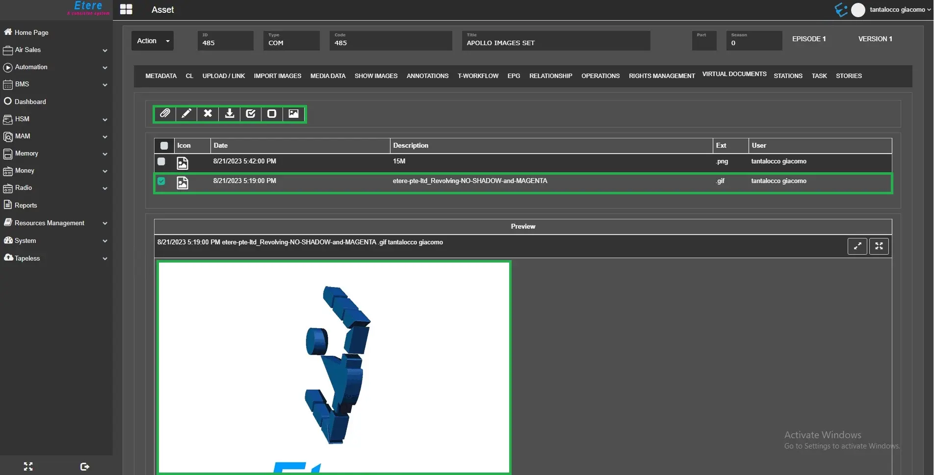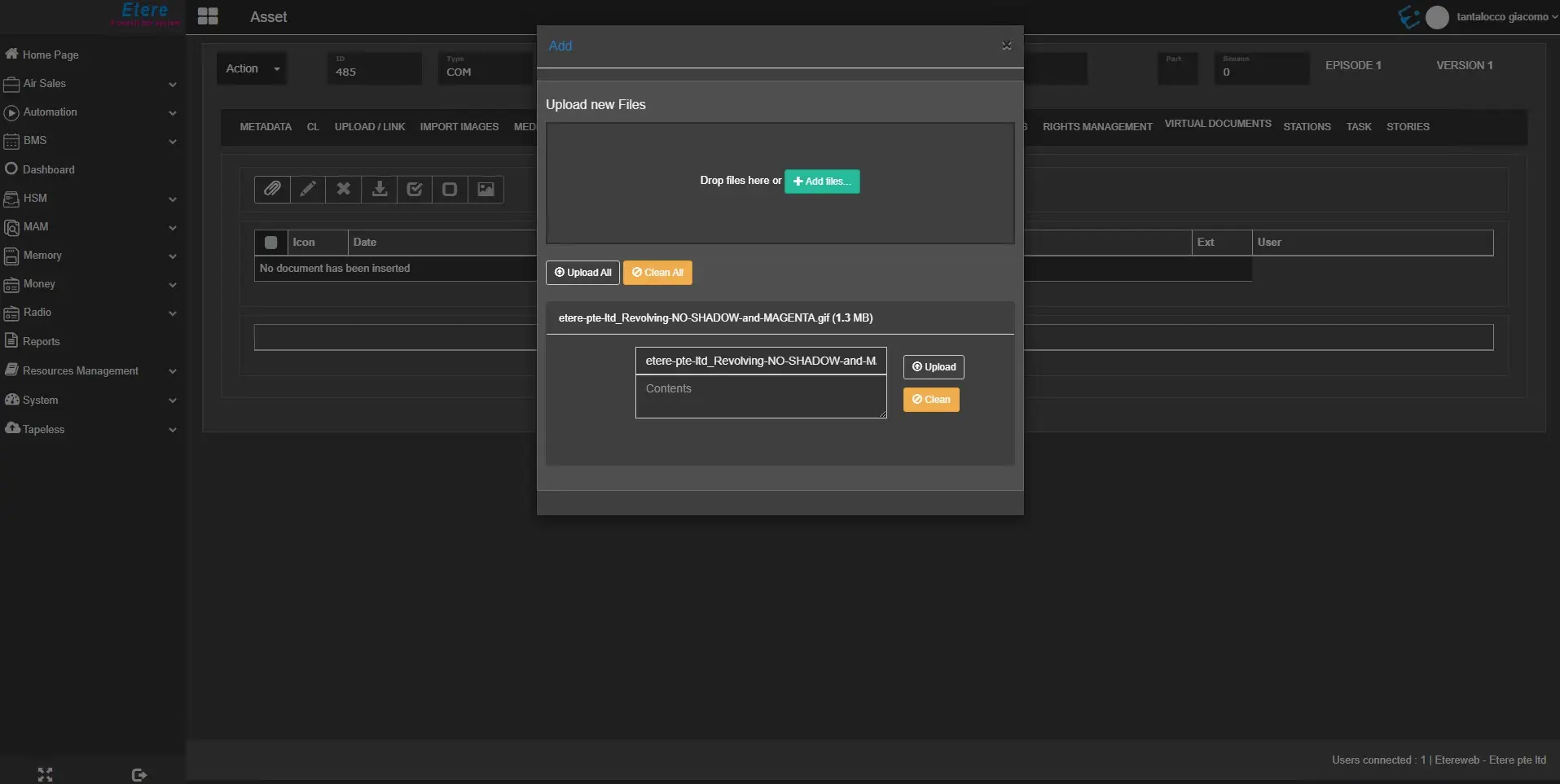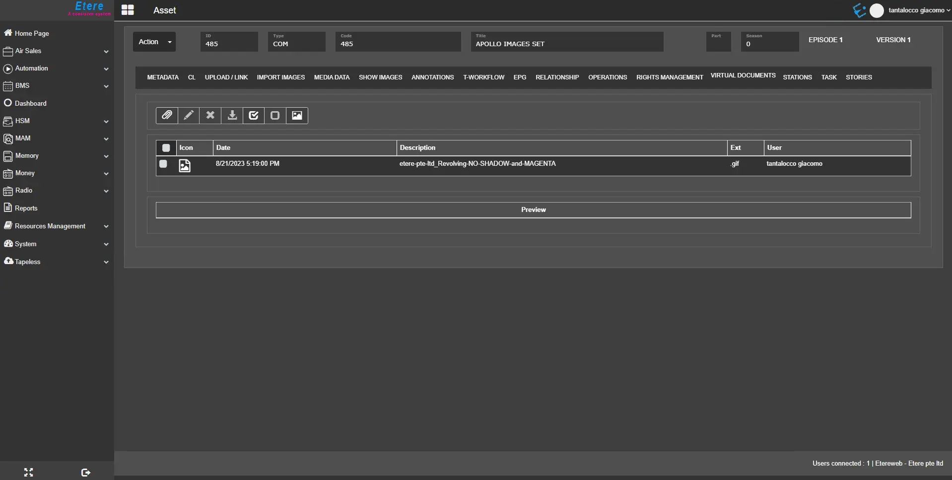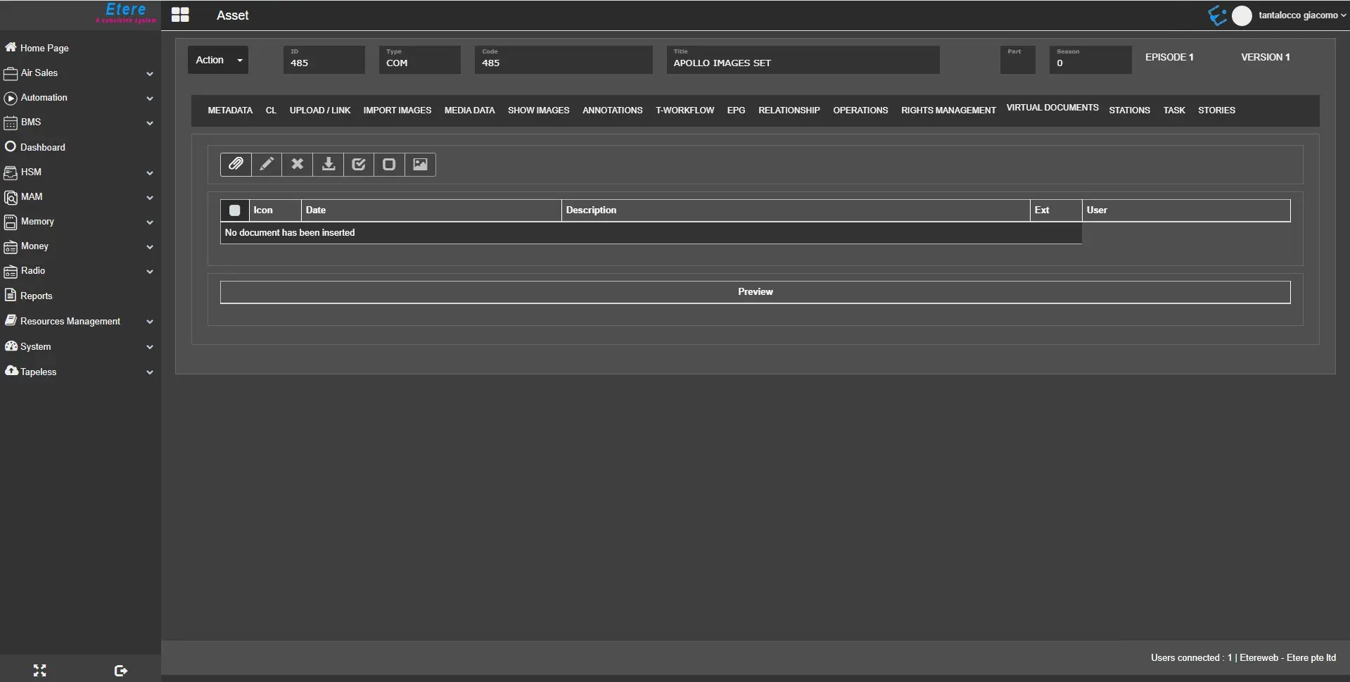 The Virtual Documents tab displayed all the digital files (e.g. image, document, PDF, text, etc.) attached to the current asset using the Etere Document Management (DoMa) feature.