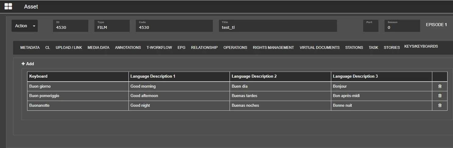 NB: Keys and Keyboards must be first created in the related sections in Etere Configuration > Settings > Media asset management. See the associated chapters for more information.