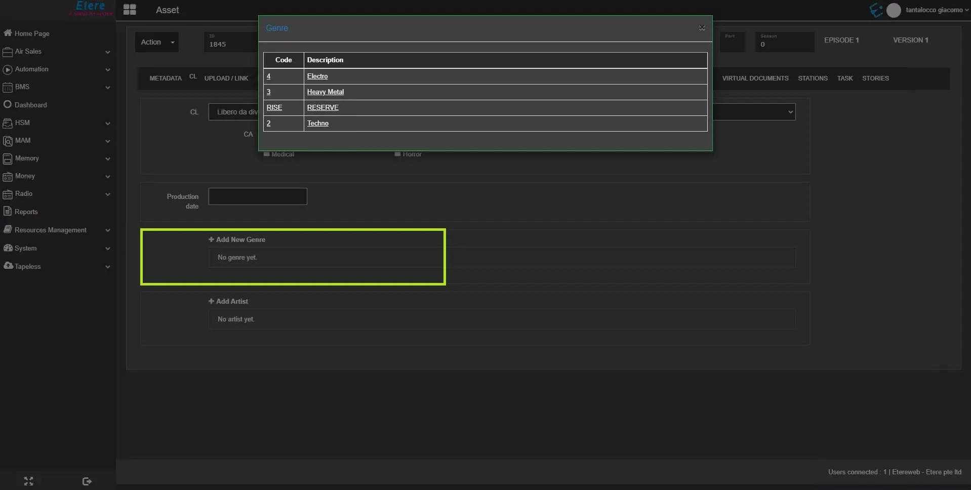From the list of genres, select the genre to be added (one at a time) to the asset form by clicking on the genre code or description.