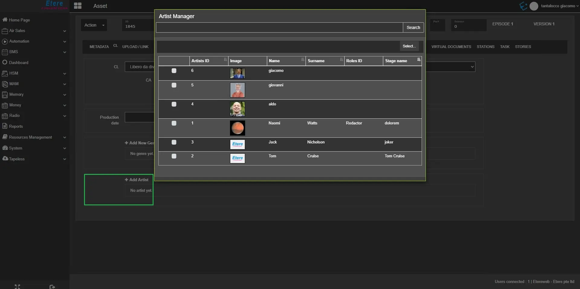 From the list of artists, select one or more artists and click the Select button to add artists to the asset form.
