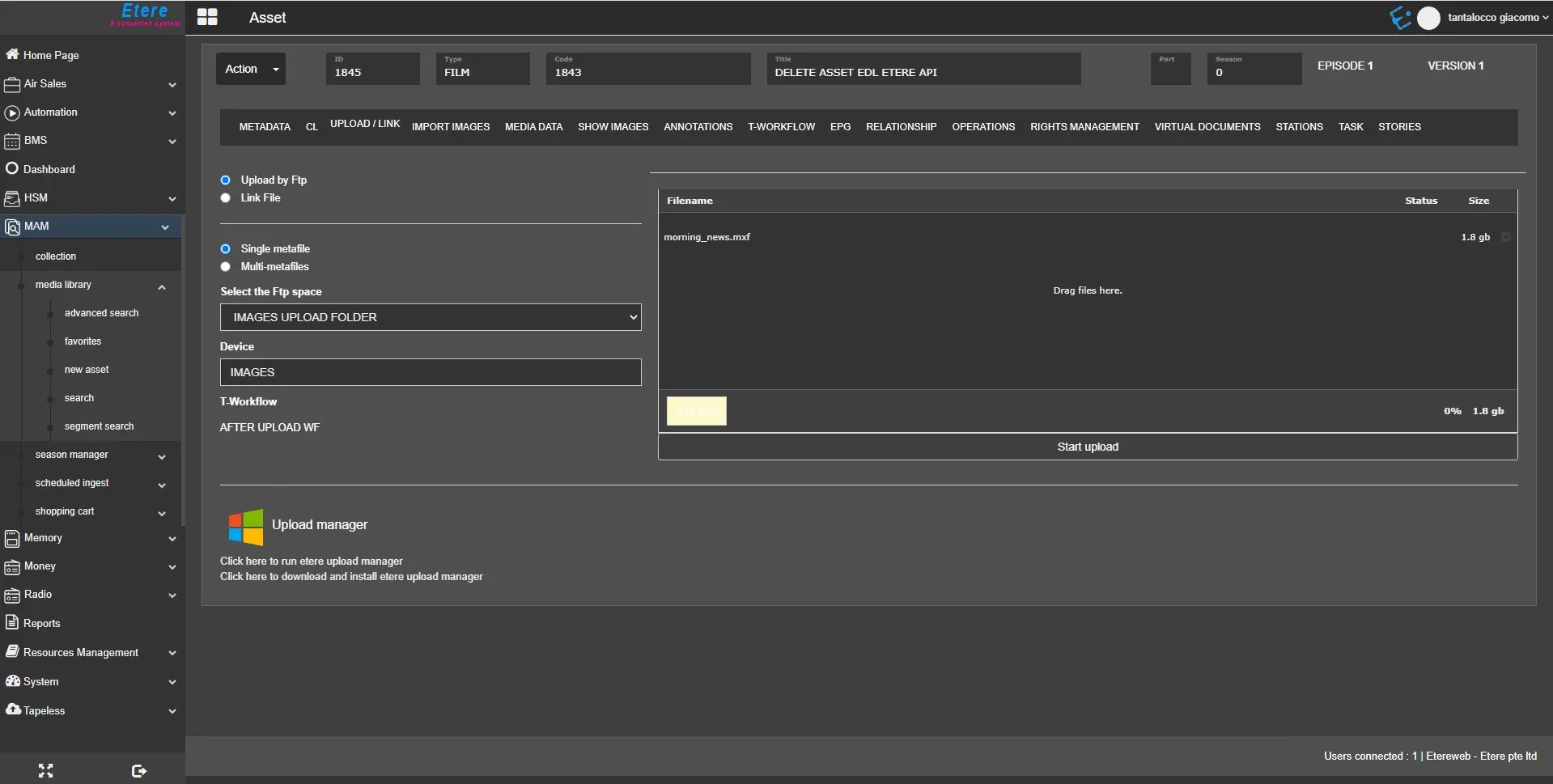When a user accesses EtereWeb with a compatible browser, the user is allowed to upload a media file to the Web server via an FTP Server or link file from a specific path.