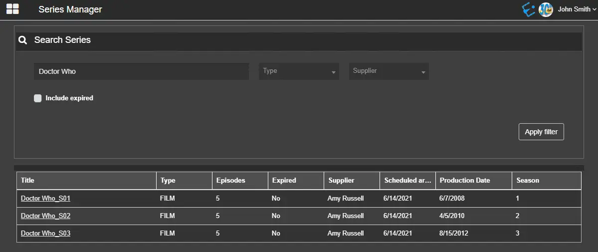 Seasons can be filtered by Title, Type and Supplier. By default, expired seasons are not included in the search results but can be found by enabling the option "Include expired".