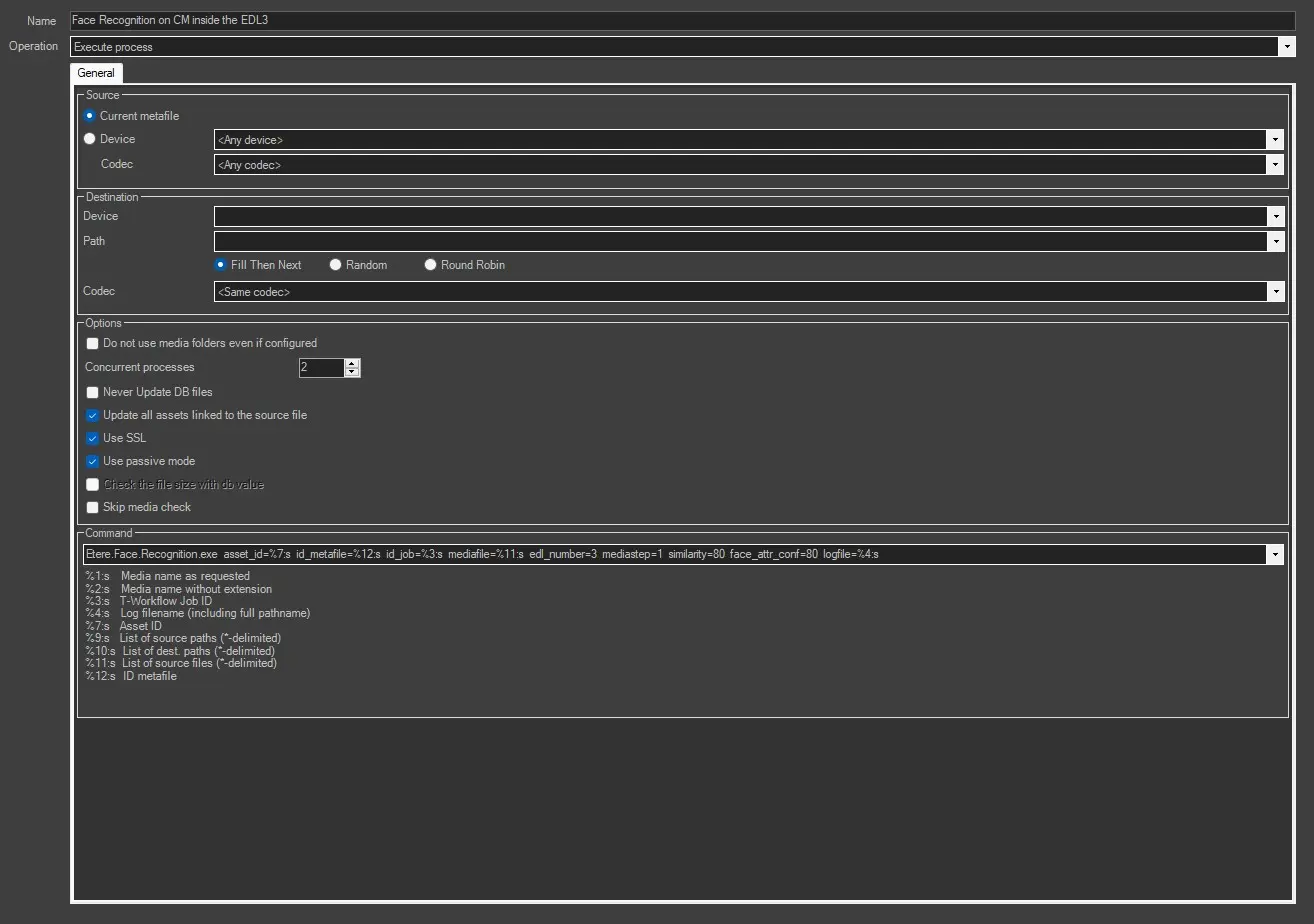 Etere.Face.Recognition.exe asset_id=%7:s id_metafile=%12:s id_job=%3:s mediafile=%11:s edl_number=7 mediastep=2 similarity=75 face_attr_conf=75 thumbnails=png logfile=%4:s