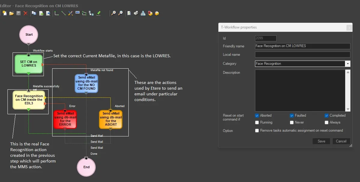 Here's an example of a Workflow used to execute the Face Recognition action in the Current Metafile Lowres.
