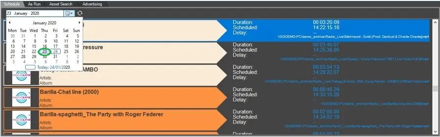 The schedule section of Radio Playout includes tabs for managing the daily schedule, the As Run and Advertisements: