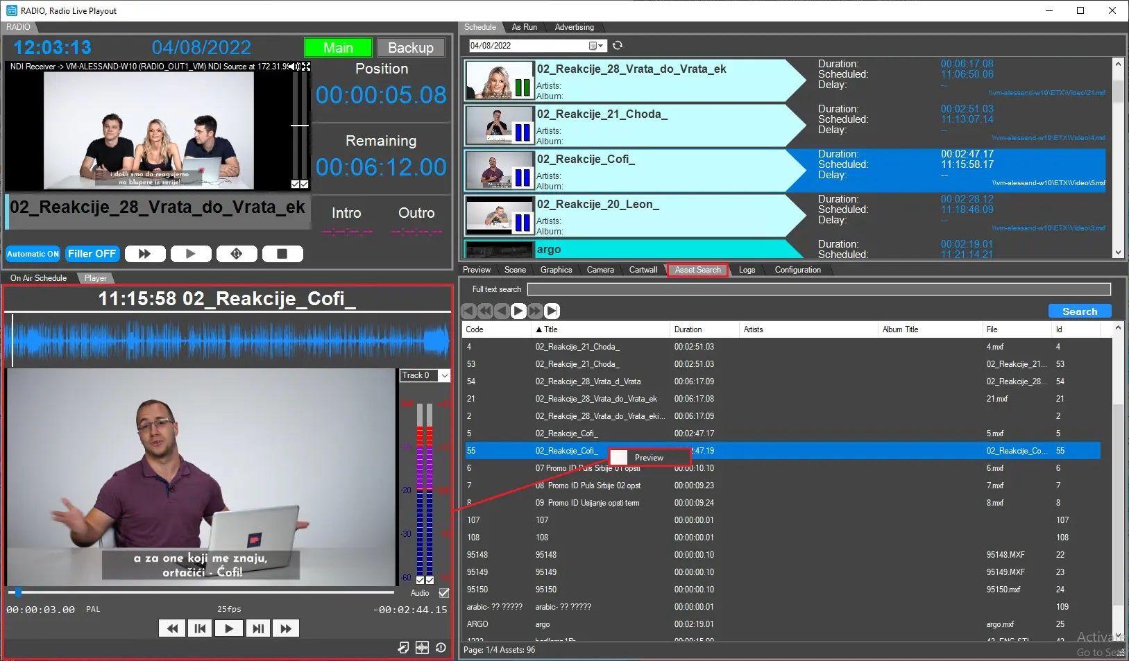 One of the ways assets can be previewed is from Schedule tab on the upper side of the Radio Playout form.