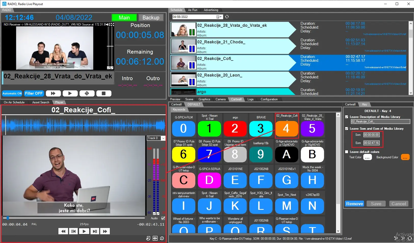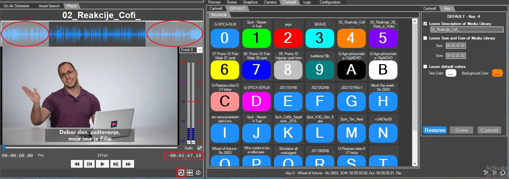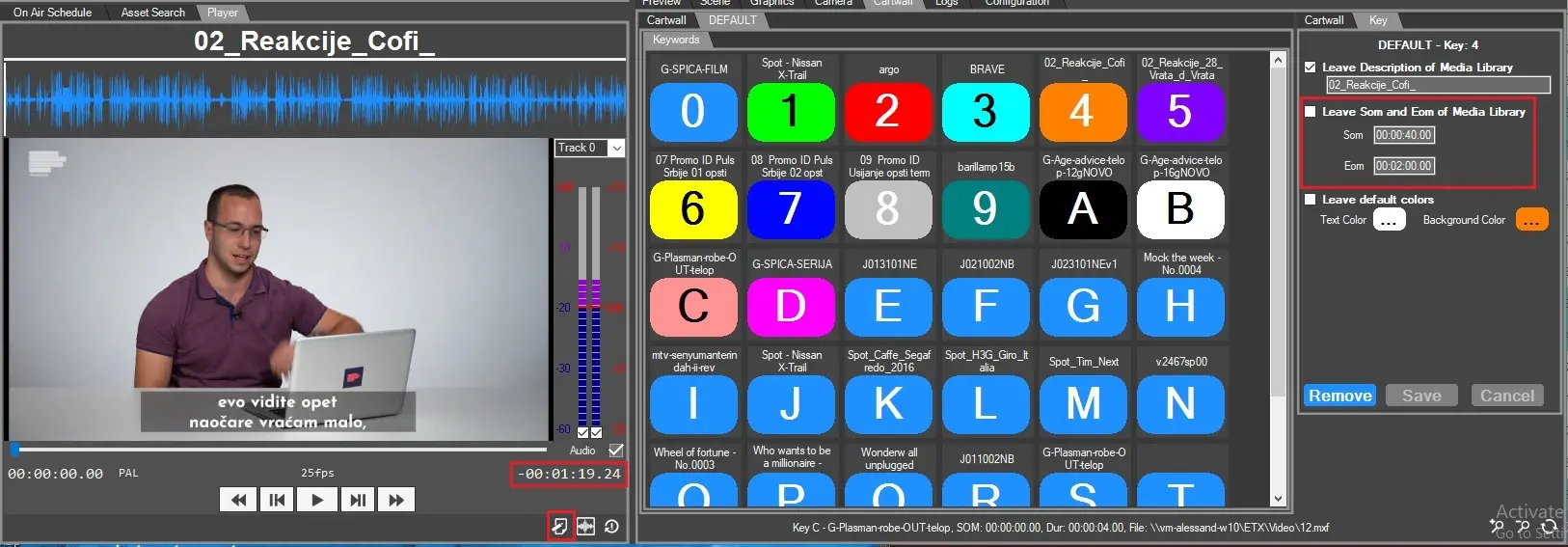 As explained in Cartwall chapter, user needs first to link the assets by drag&drop from asset search tab. Once done, it's possible to customize the part of the file to play setting SOM and EOM in the Key tab, then clicking on the button, Radio live Playout will look for the physical file and play it.