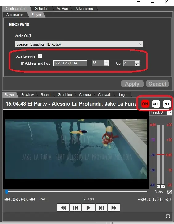 NOTE: The preview can be started by mouse or by GPI(when the button on the mixer is pressed), GPI is enabled under Configuration > Player by enabling Axia Livewire