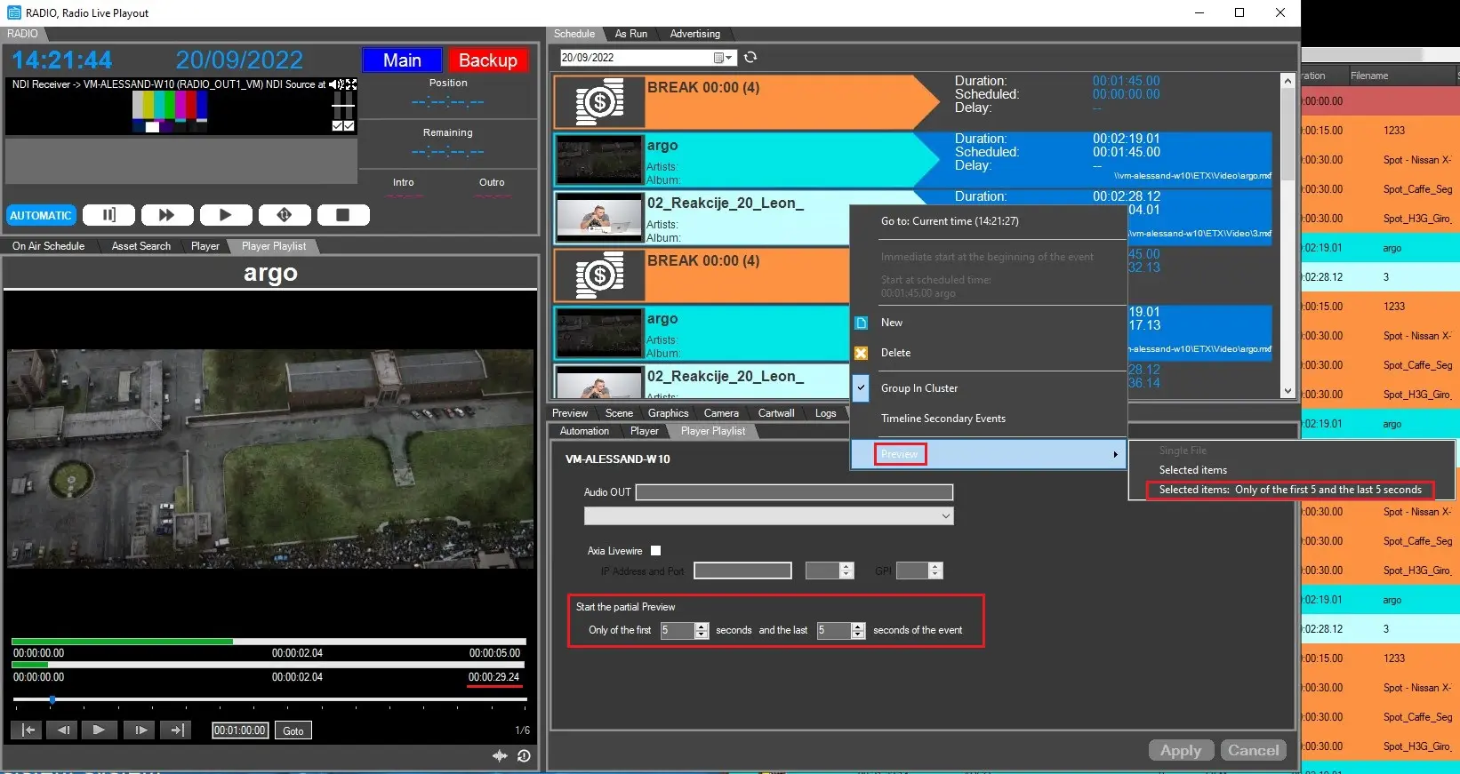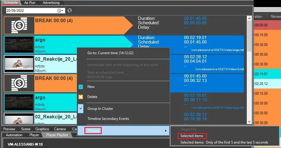 Radio Live Player Playlist allow to play a list of scheduled files and, according to how it's configured, allow to preview the first and last seconds for each one of them.