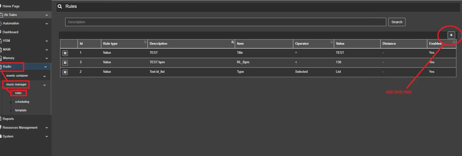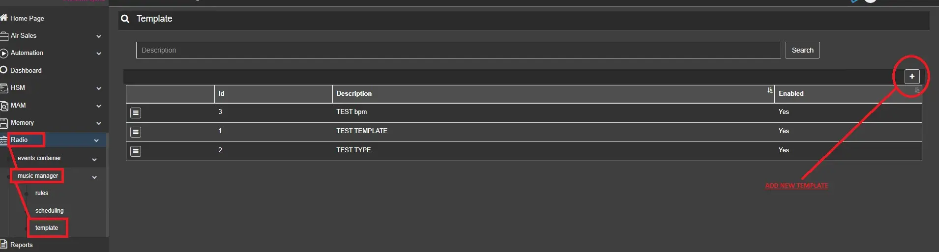 we can create a template going to Radio->Music manager->Templates and click on the "+" symbol on the right side of the page that will openit will allow us to give the template a name, enter a description and flag the rules we want to insert within the latter.