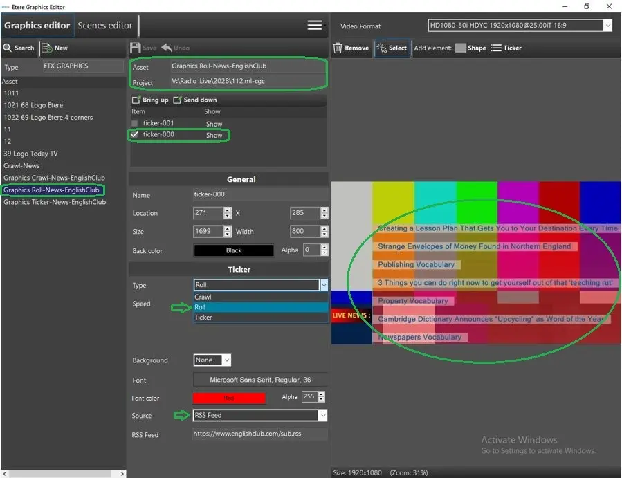 •In Ticker section, select “Roll” to view the rolling ticker in graphics asset.