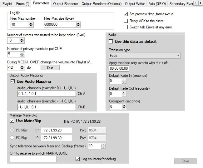 In this tab are listed options and parameters regarding log files, Fade , Output Audio Mapping, Main/Bkp options and general parameters. Once set, press "Save" button.
