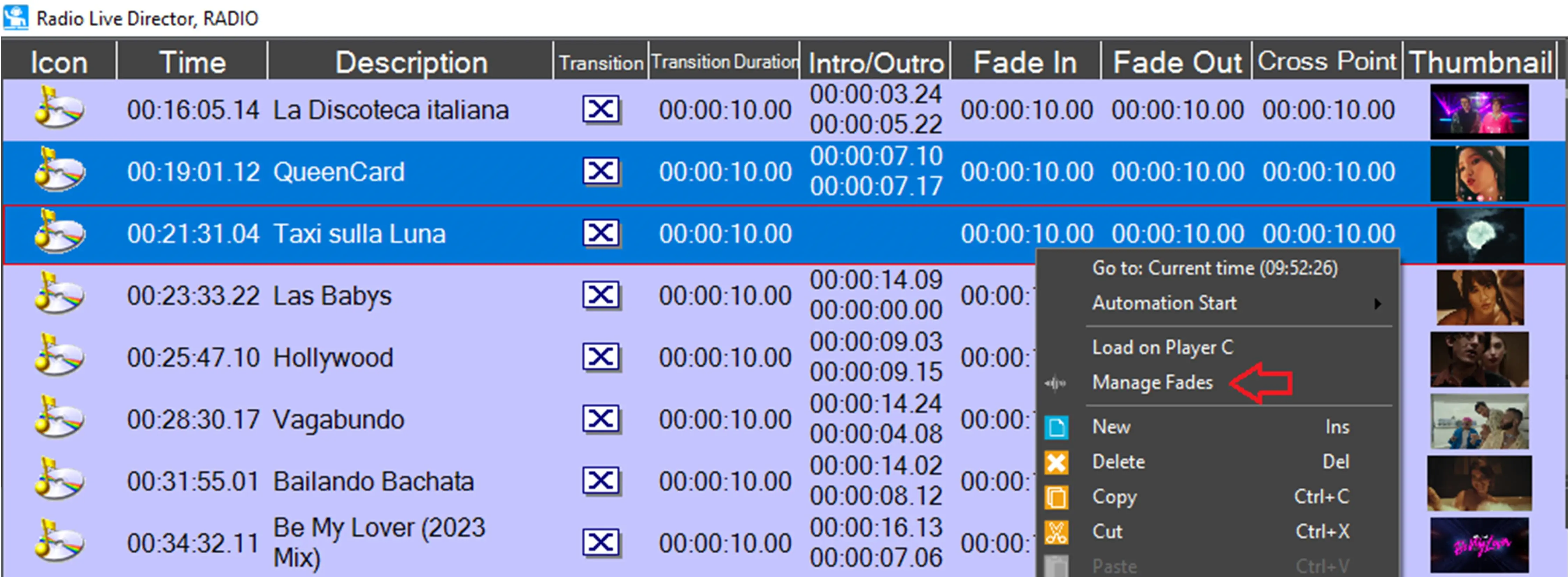 To access the fades management window, it's enough to select one or more assets in Radio Live Director schedule, right click on them and select Manage Fades.