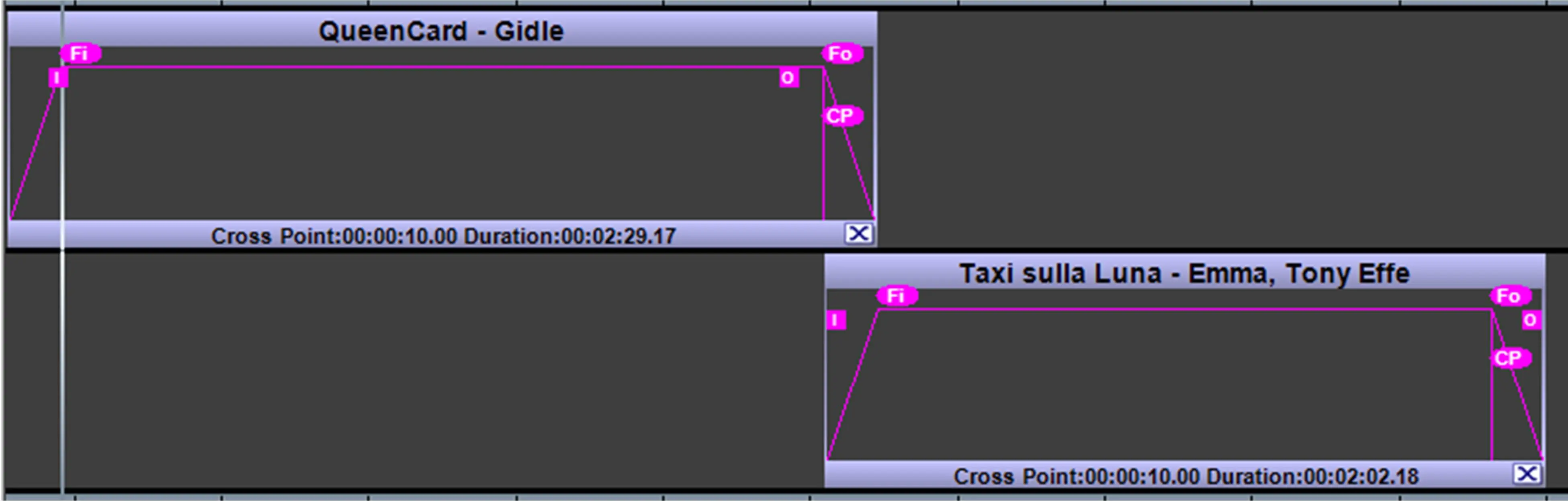 Cross Point (CP icon): This label lets you define the starting time where the two clips start overlapping, the setting is applied to the selected clip against the previous clip (so it is valid for clips starting from the second).