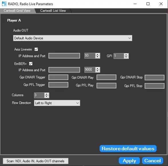 Player A - Axia Livewire: Enable it if there is Axia Livewire installed in the system and it's used to manage the audio output. Specify the IP address, port where the software is installed, and the GPI that should be controlled.
